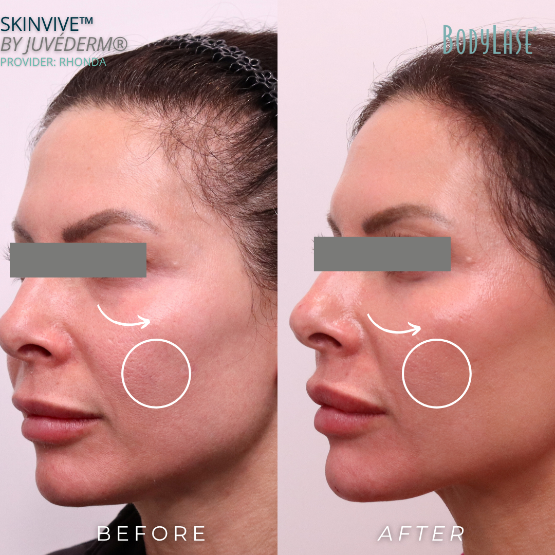 Skinvive provides deep hydration, improving skin elasticity and firmness. While it does not add volume like traditional fillers, it improves pore size, smooths skin, and gives a glow-from-within look.